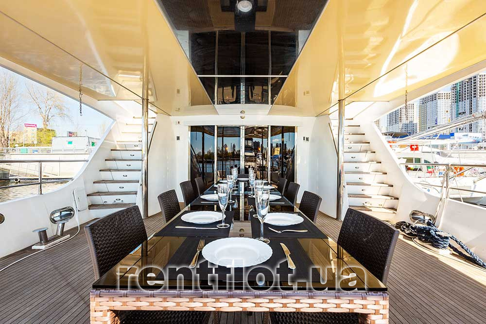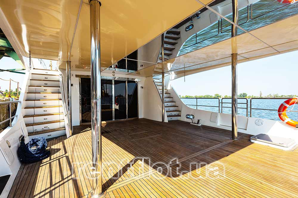 - полуоткрытая площадка на корме со столом и стульями