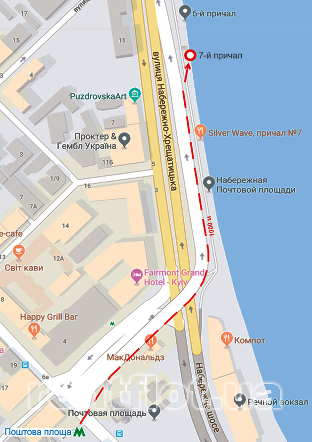 - причал №7 речвокзала находится в 400х метрах от ст.М.Почтовая пл. и в 300х метрах от речного вокзала в направлении Гаванского моста. GPS-координаты: 50.462009, 30.526327 (указанные числа введите в Google-поиск)