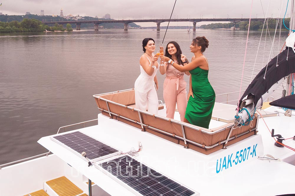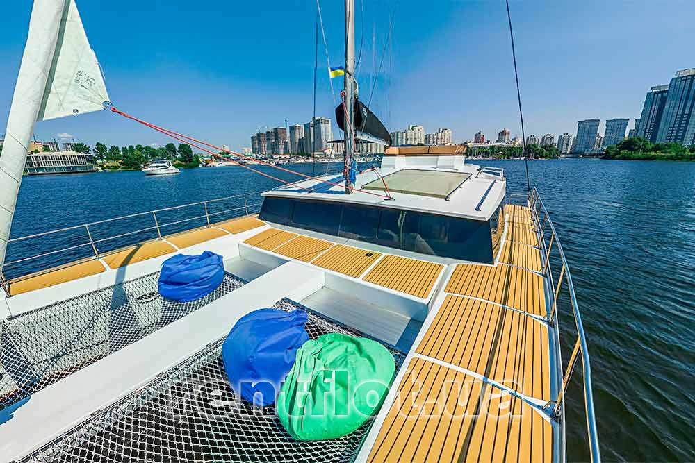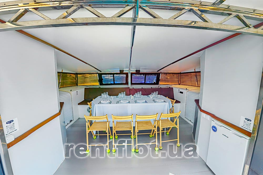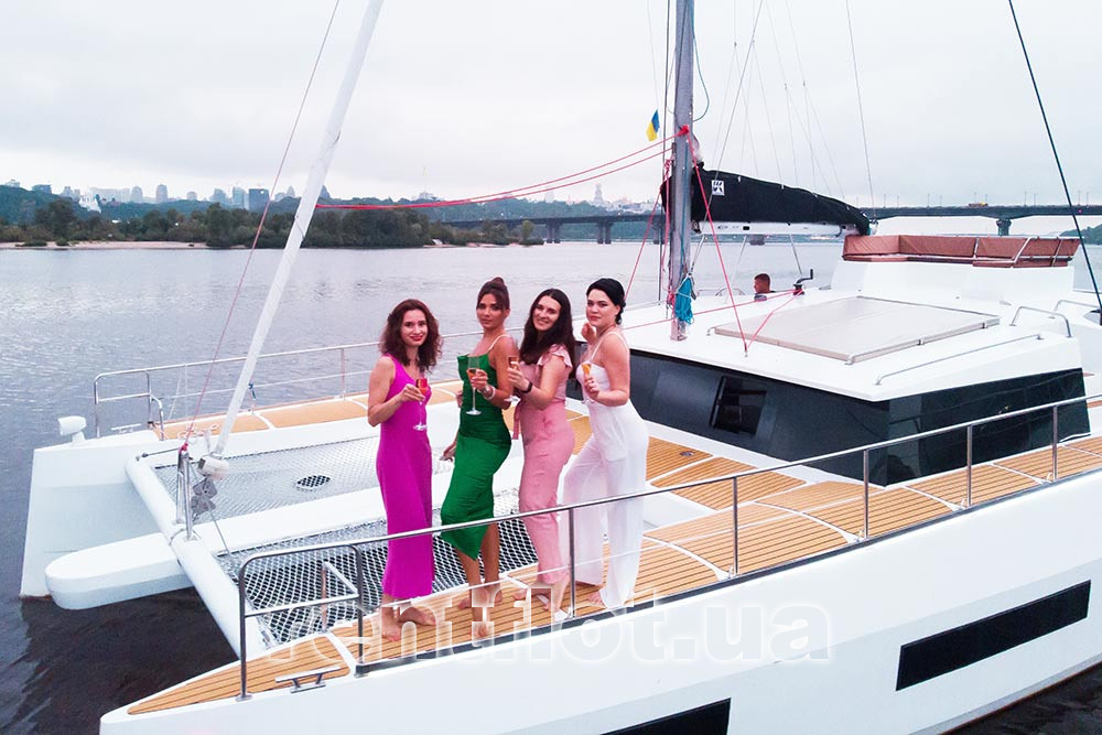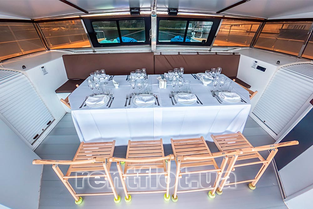 Вітрильний катамаран престиж-класу з салоном для банкетів і відкритим танцмайданчиком.