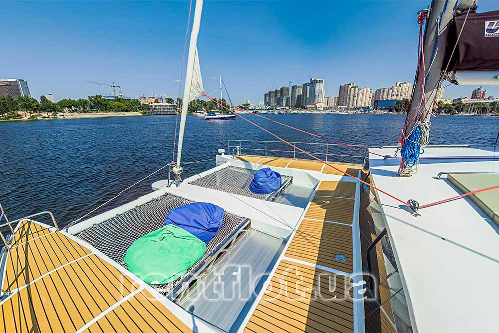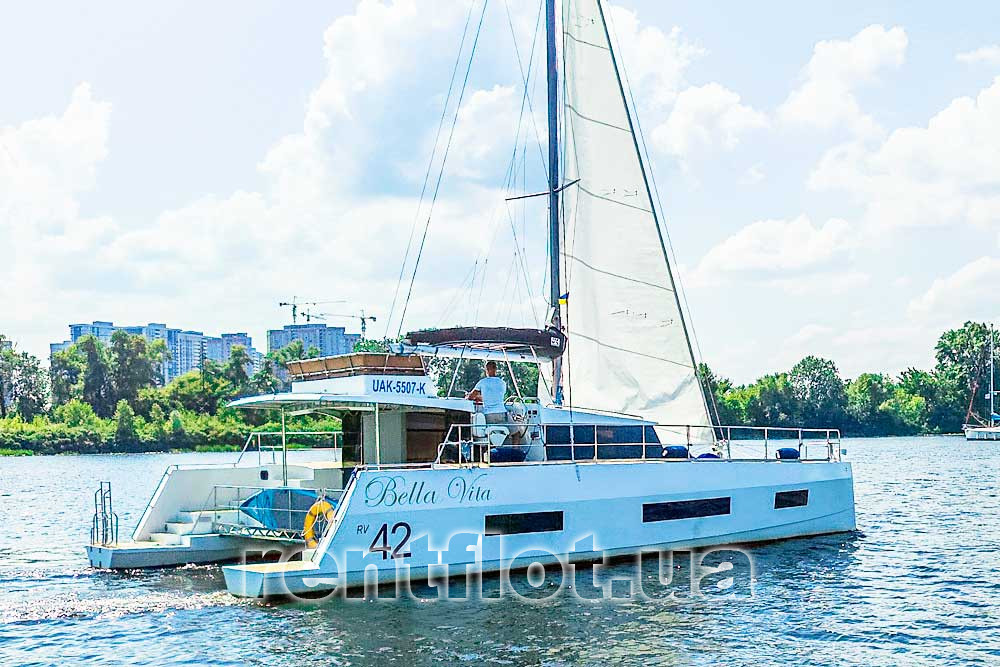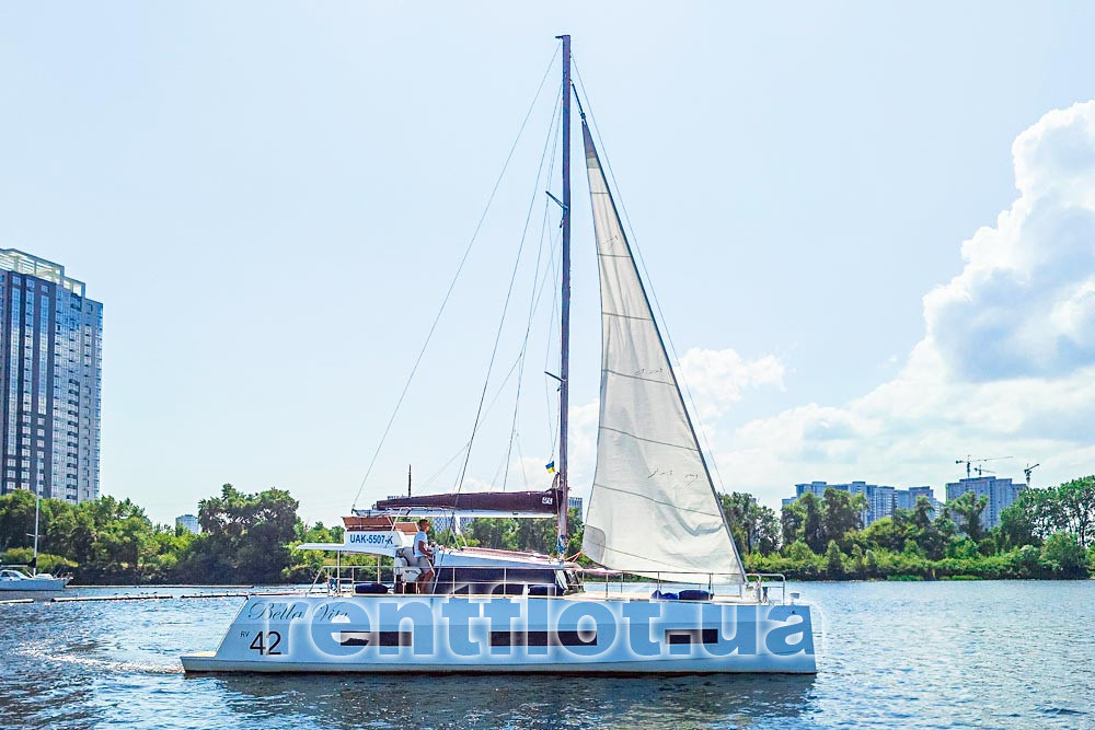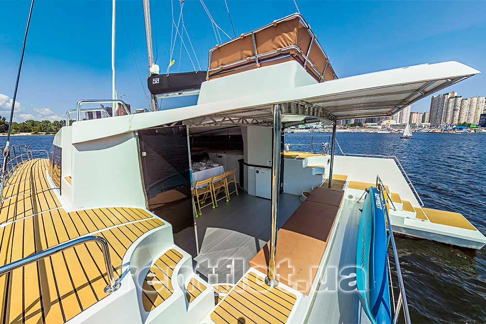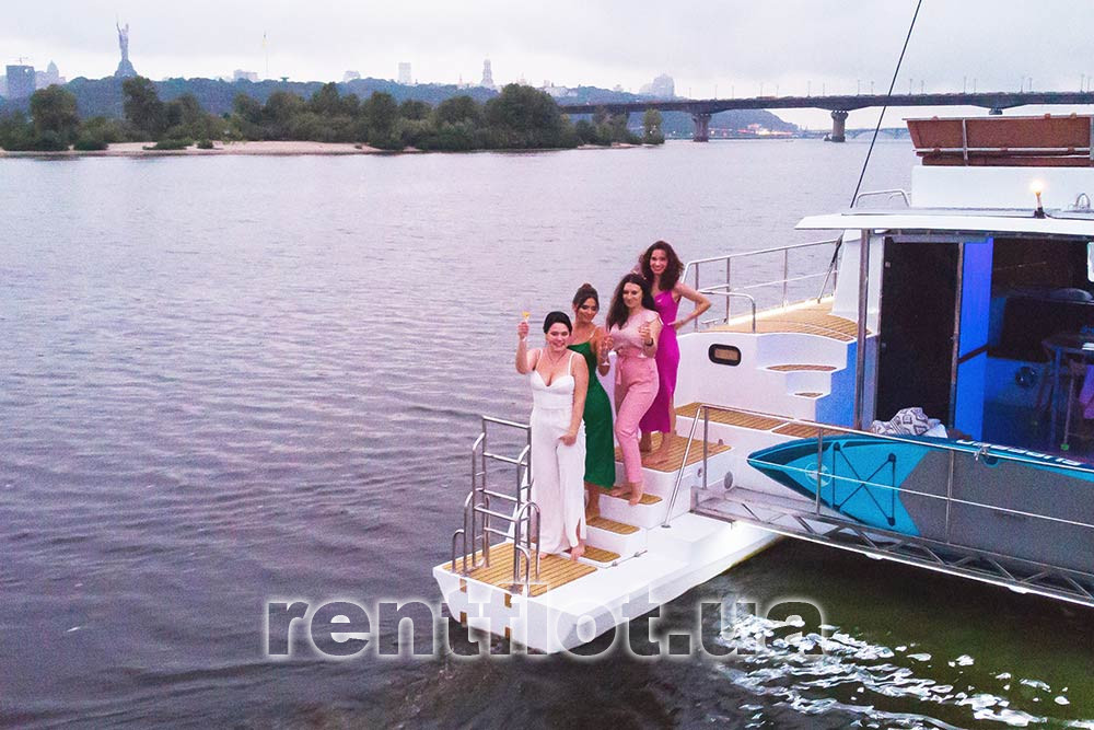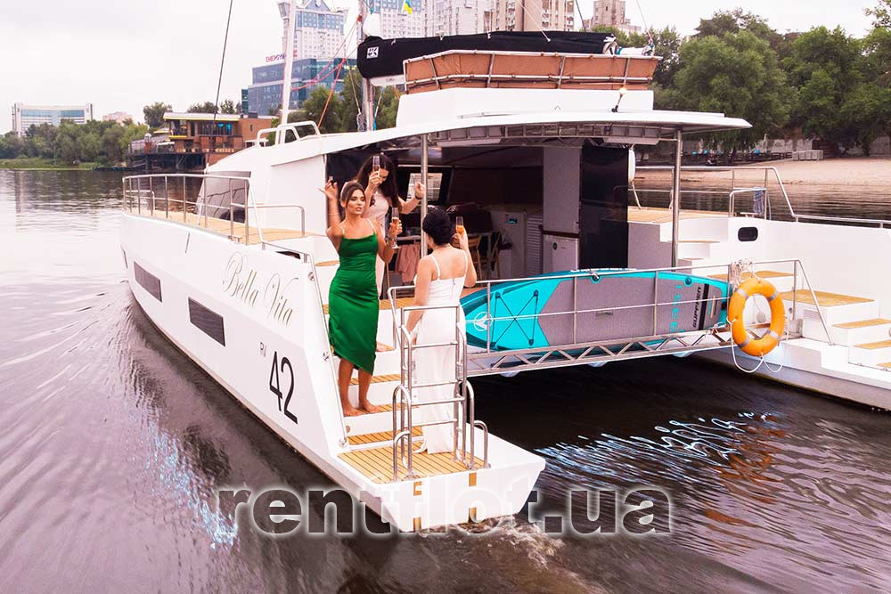 Вітрильний катамаран престиж-класу з салоном для банкетів і відкритим танцмайданчиком.